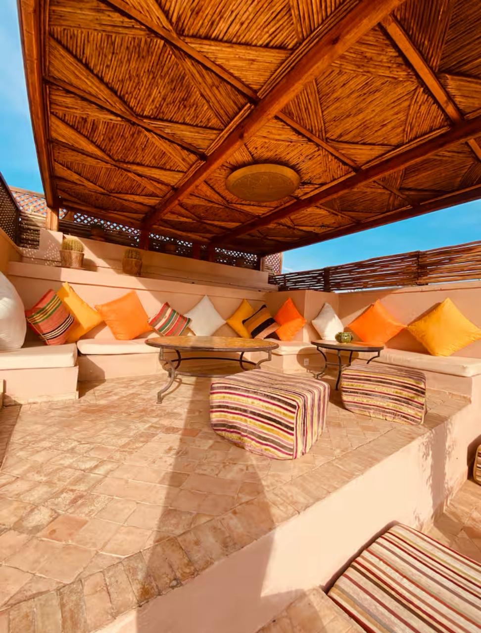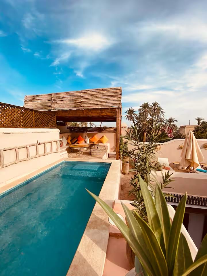 The rooftop terrace is a true highlight, featuring a swimming pool, a shaded lounge area, and multiple relaxation spaces—perfect for enjoying the Marrakech lifestyle under the sun.